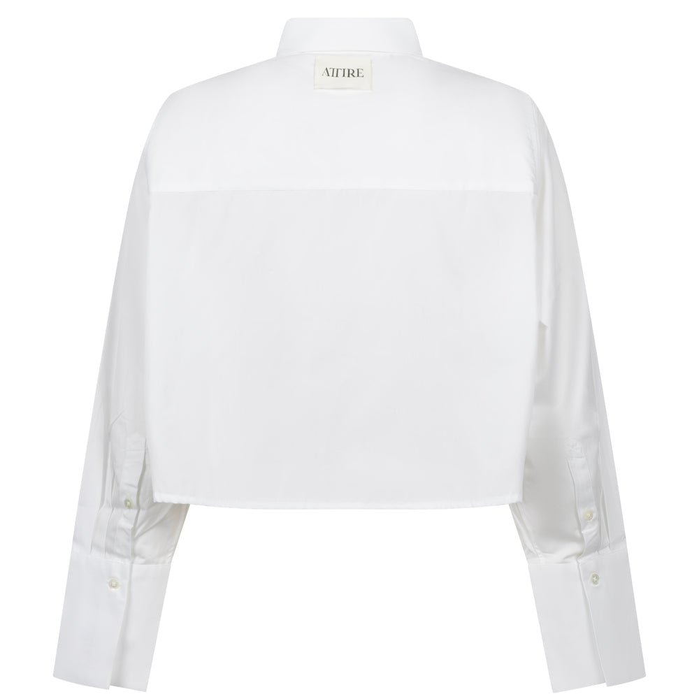 Deze witte cropped blouse heeft een strikdetails aan de voorzijde. De klassieke knoopsluiting en tailored kraag geven een chique twist aan het oversized design. De korte pasvorm creëert een moderne shape die perfect balanceert tussen casual en sophisticated.